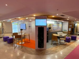 Cependant, ce stand présente des inconvénients majeurs. Il ne permet aucune personnalisation et n’apporte aucune valeur ajoutée en termes d’image de marque. Il s’agit davantage d’un espace fonctionnel, comparable à un bureau temporairement déplacé sur le lieu de l’exposition.